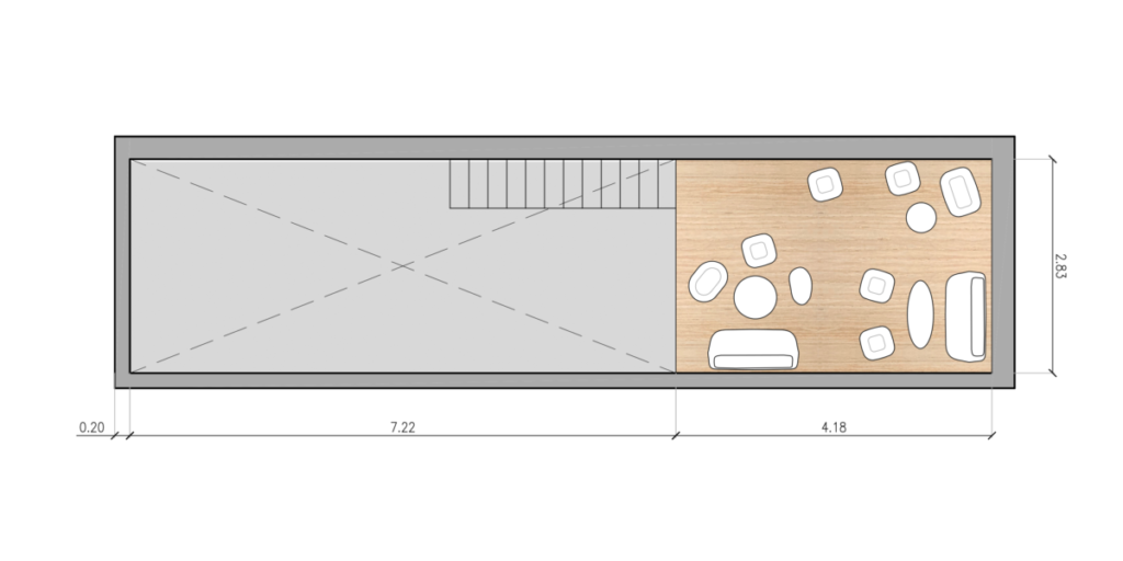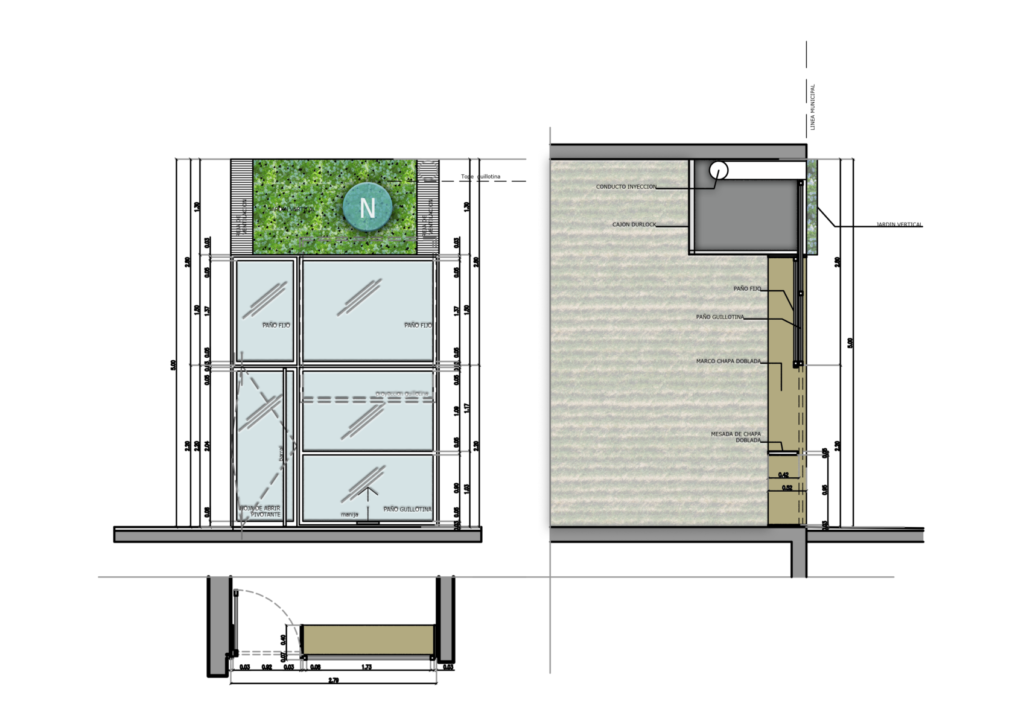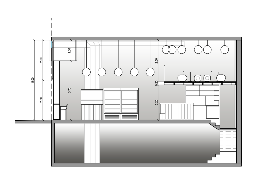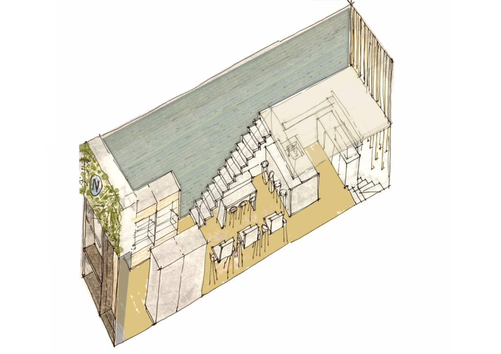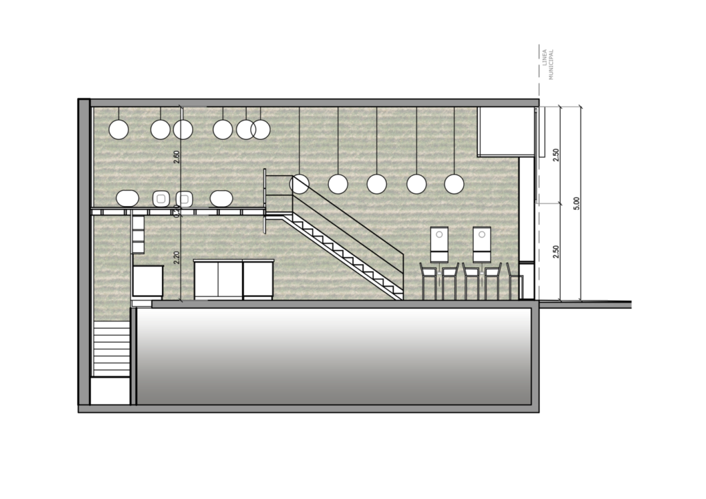 En cuanto al espacio, un contenedor angosto y alto, ubicamos un entrepiso ya que la altura del local lo permitía y ubicando un sector de livings con mayor privacidad y la opción de reuniones. En la vereda, muy transitada, proponemos la ubicación de una mesa comunitaria lineal con toldo a dos aguas, que puede ser fija o móvil, rodeada de canteros verdes. Para el equipamiento mobiliario se propusieron varias alternativas: Barra, pequeñas mesas, mesadas corridas.