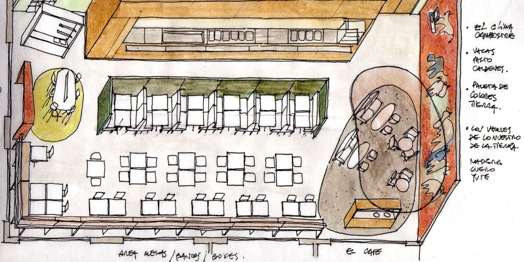 El concepto de la ambientación apela al espíritu campestre, utilizando una paleta de colores cálidos y materiales con texturas naturales. Se propuso un cambio en el ambiente mediante el uso de materiales que expresaran nobleza, identidad y relación con la naturaleza, vinculándose así con los valores e imagen corporativa de la empresa. Intentando romper con la fria imágen industrial y de comedor en una planta de industria alimenticia e intentando llevar algo del exterior, a modo de espacio restaurant/bar, se propuso incluir un mural decorativo con motivos temáticos que otorgara carácter al salón apoyando la imagen propuesta.