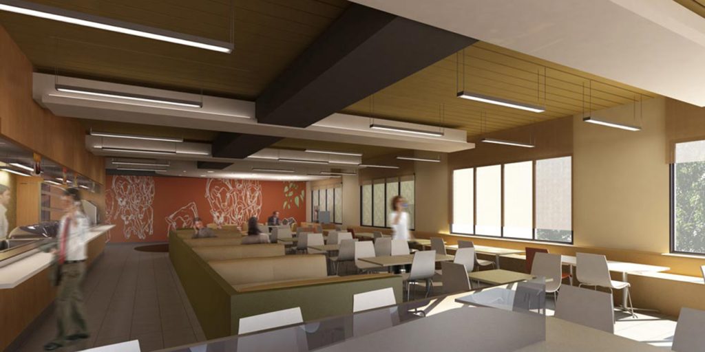 El programa incluyó resolver la convivencia de casi trescientos comensales de diversa función y jerarquía, operarios y empleados administrativos haciendo posible también la separación por turnos dependiendo tipo de servicio brindado. Como propuesta funcional, se renovó la línea de servicio con equipamiento nuevo. Se reordenaron y redimensionaron los diferentes módulos en relación a la nueva oferta de servicio, donde se agregaron mas ofertas de menúes. La devolución de bandejas se resuelvió mediante la ubicación de dos estanterías pasa bandejas fijas en el tabique divisorio del sector lavado, con puertas para evitar el pasaje de ruido, y se tamizó su vista mediante un tabique mueble. En cuanto al Salón Comedor, se diseñaron cuatro zonas, de modo de producir diferentes situaciones de modos de comer: Zona de Boxes, Zona de mesas clásicas, Zona de Barras y Zona de living. Así tendremos un sector de mayor intimidad, un sector mas comunitario, un sector de comidas ágiles y uno de reposo, relacionado con el momento del café. El equipamiento es de tamaño y forma que permitiría diferentes configuraciones según el tamaño de los grupos de comensales o diferentes eventos.