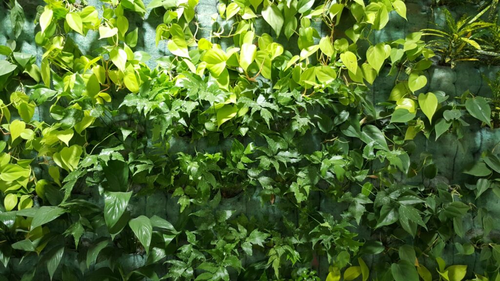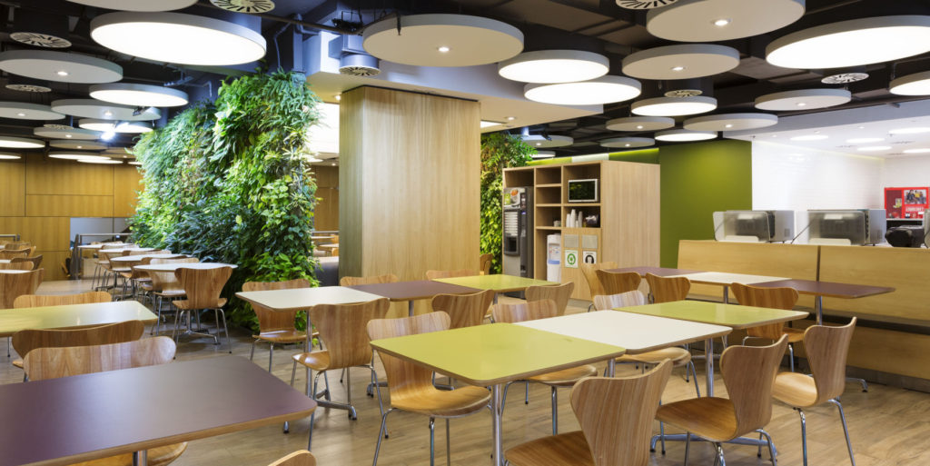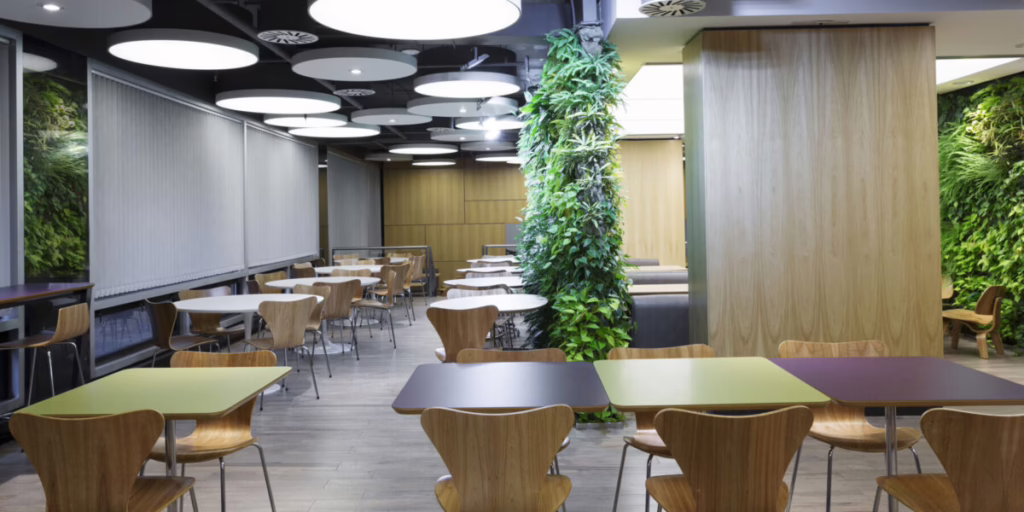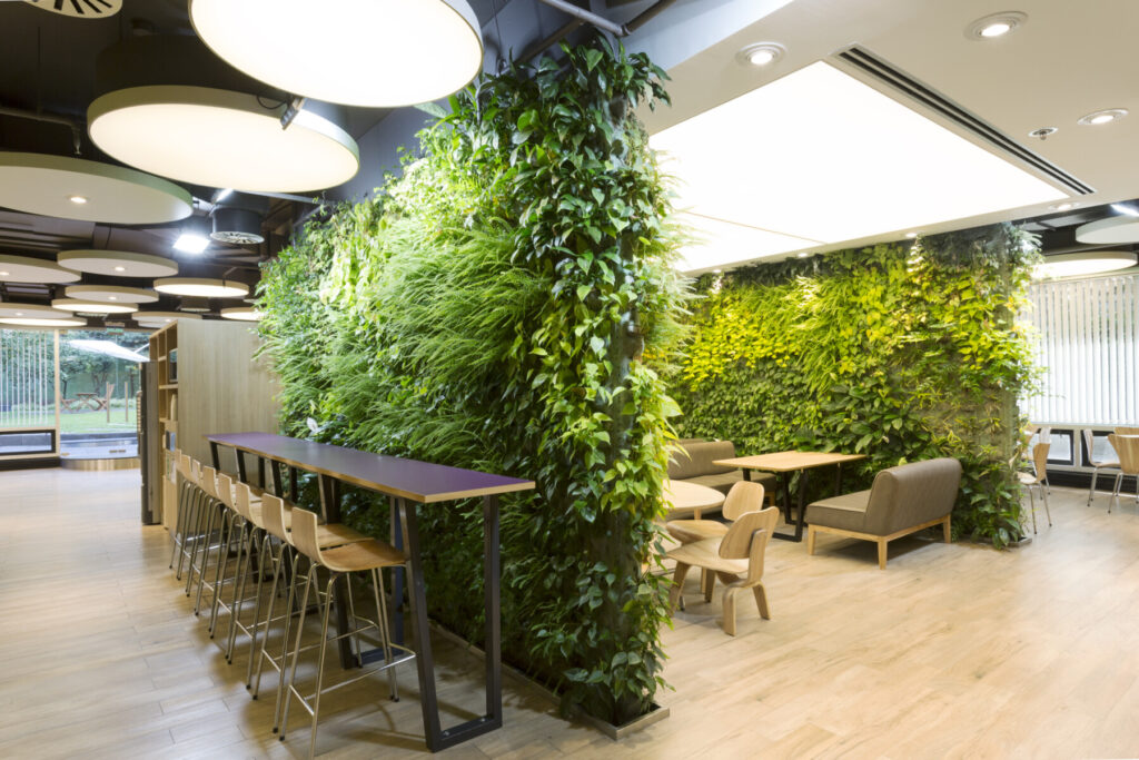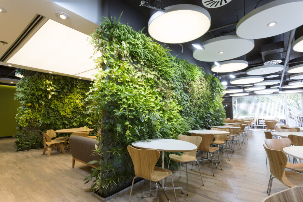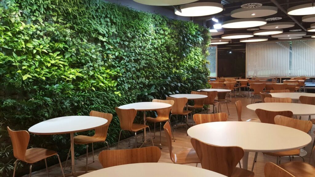 En el centro del comedor y área con menor afluencia de iluminación natural, se sitúa un espacio rodeado por un jardín vertical hidropónico. Este sector de mesas bajas y confortables se envuelve de plantas que brindan una profunda sensación verde, aportando frescura y una textura natural. Este «corazón verde» es el foco del espacio interior.
