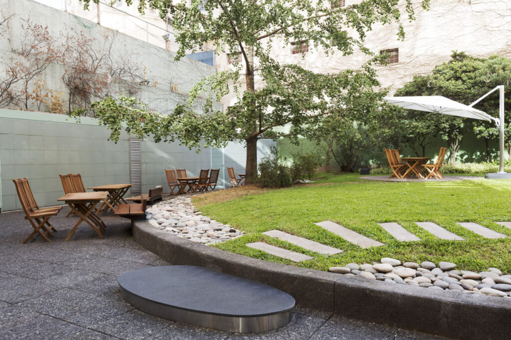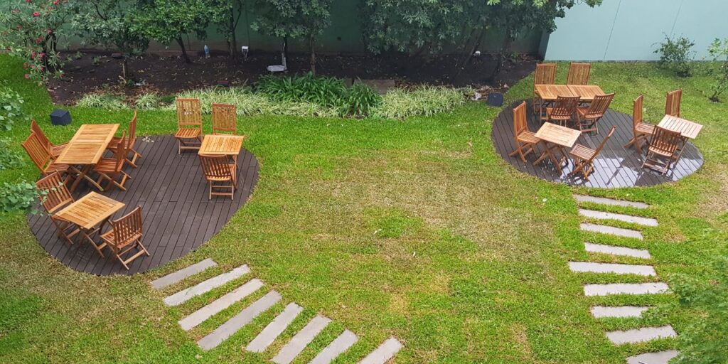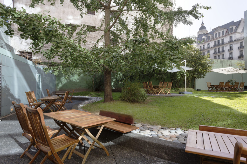 El jardín se rediseño considerando la vegetacion existente, como un árbol Ginko bilova añoso y varios arbustos, ya consolidados. En el se incorporaron senderos y una serie de decks con mesas y sombrillas.